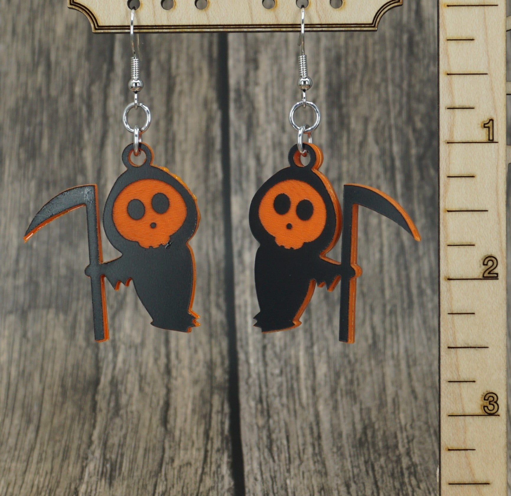 Black and orange dual layer acrylic grim reaper earrings with the image on the front and back.