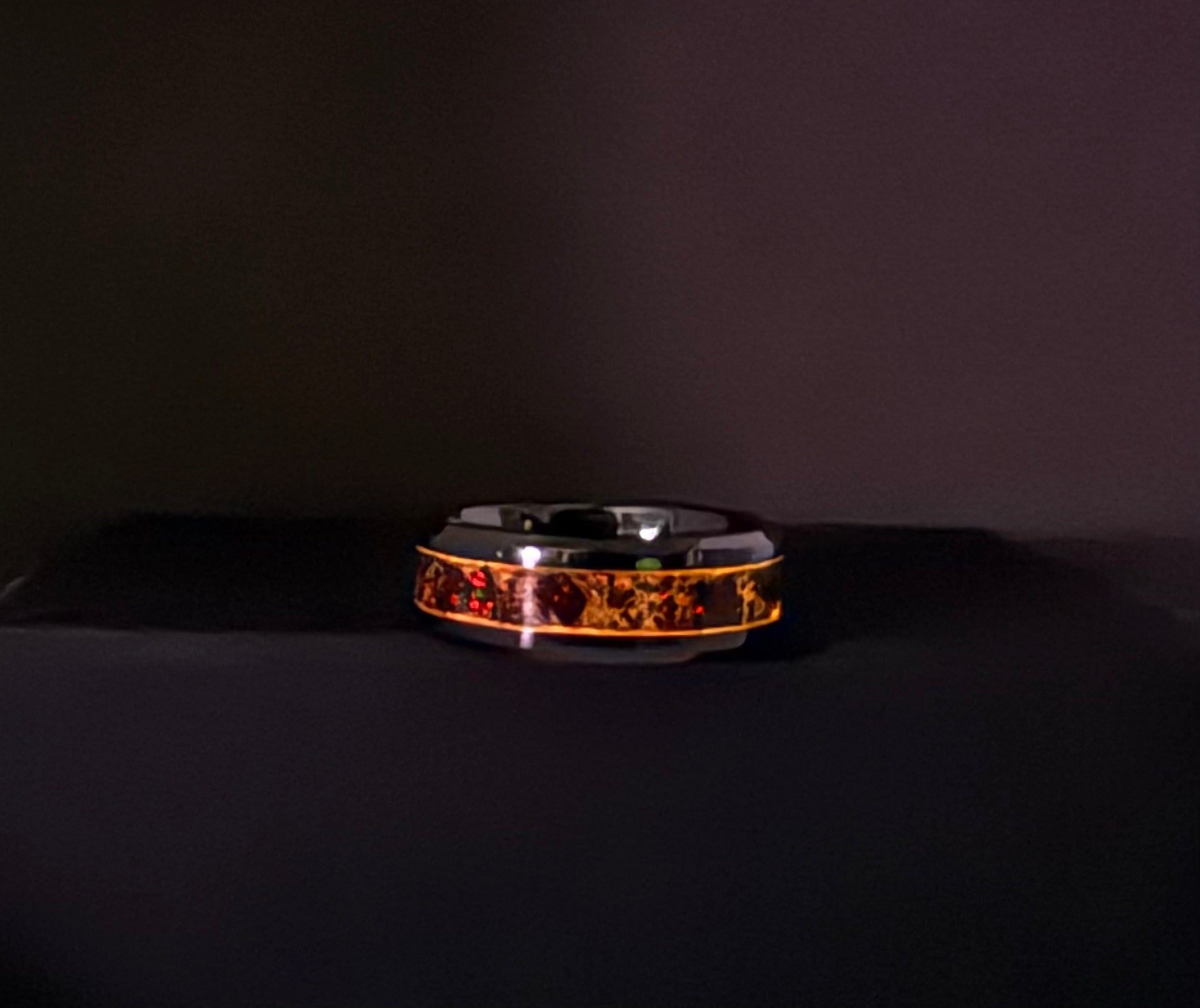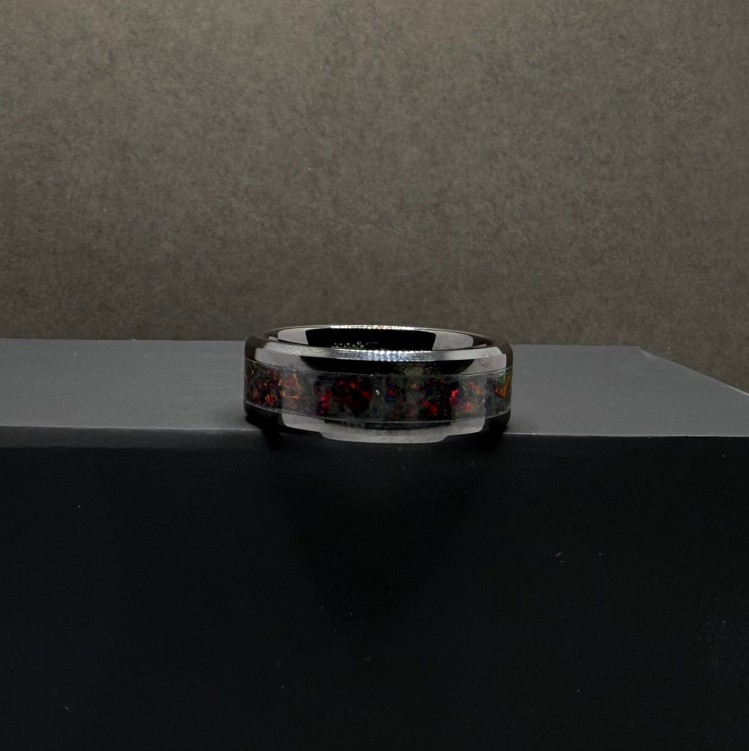 8mm black ceramic band, dark gray background, dark red opals, red and orange glow US size 10.5