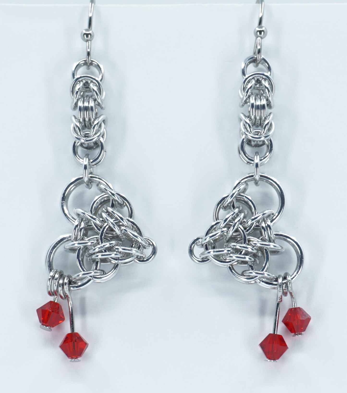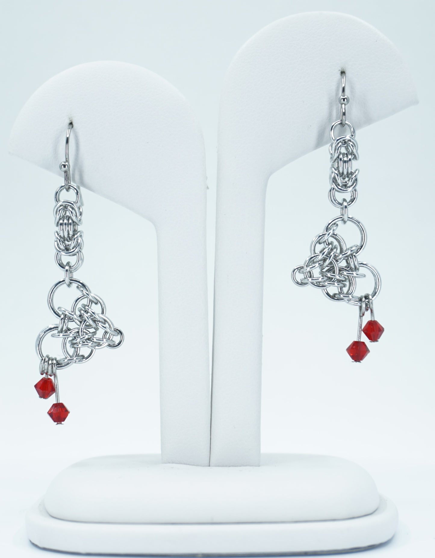 Tiny silver hearts made from bright aluminum, which makes these earrings super light weight. Small red glass bead drop accents. Comes with stainless steel earwires