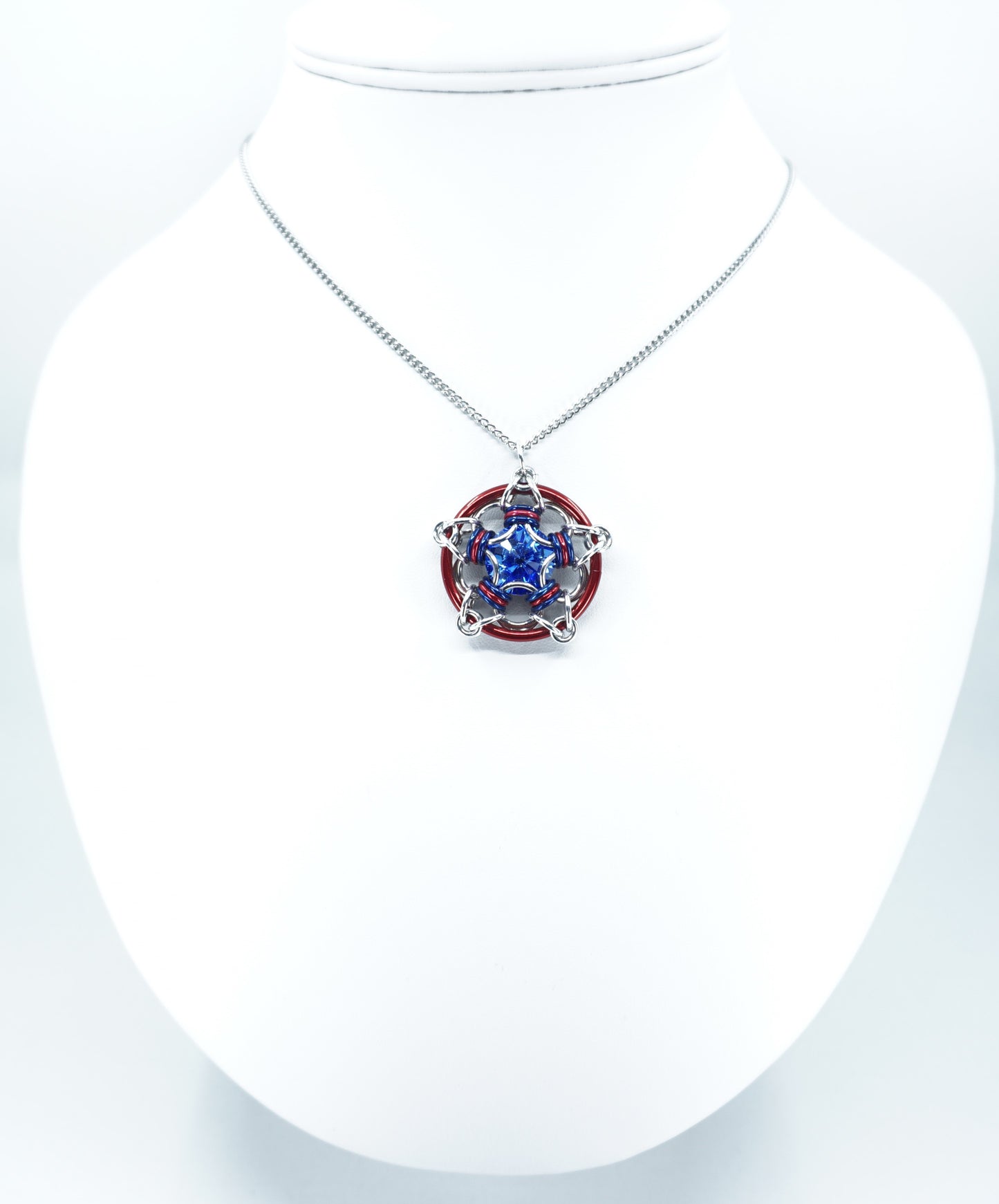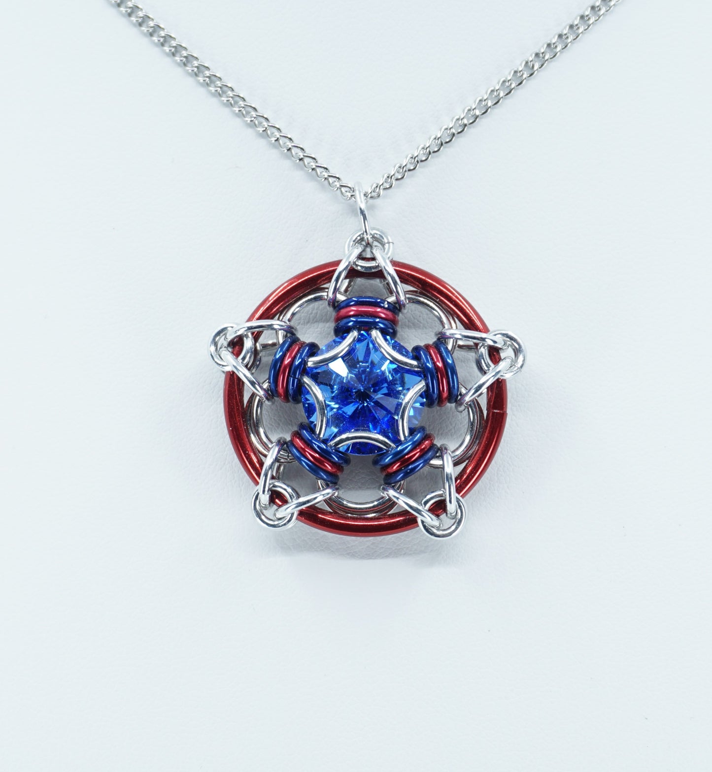 Light Weight bright aluminum and red and blue anodized aluminum capture a bright red light Sapphire 14mm Swarovski crystal. Stainless steel chain included
