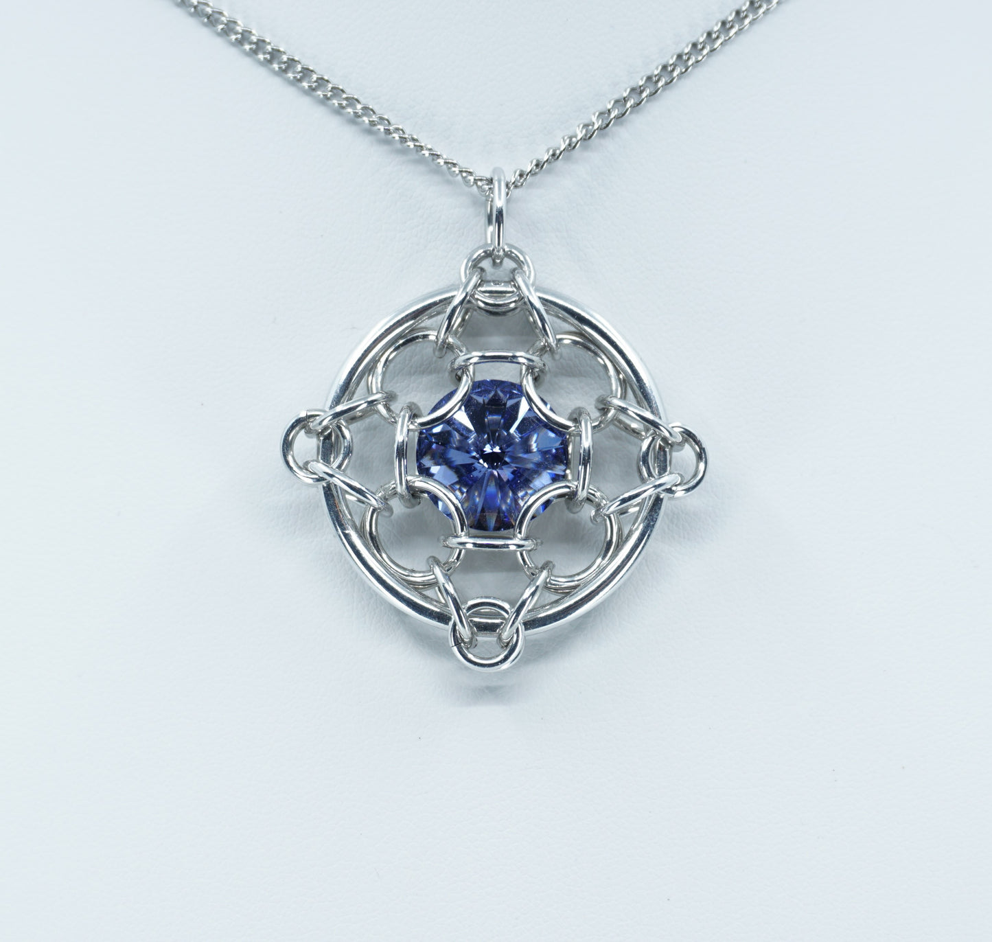 Light Weight bright aluminum capture a Tanzanite 14mm Swarovski crystal. Stainless steel chain included