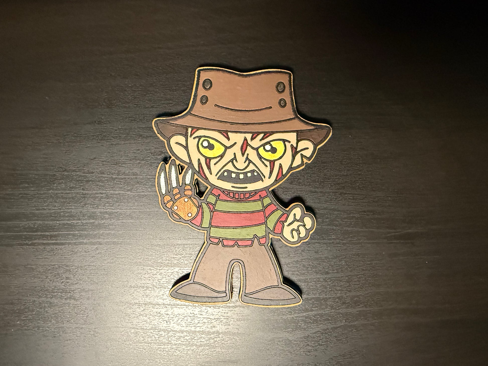 Hand painted Freddie Kruger magnet medium size. 5 inches tall and 4 inches wide.