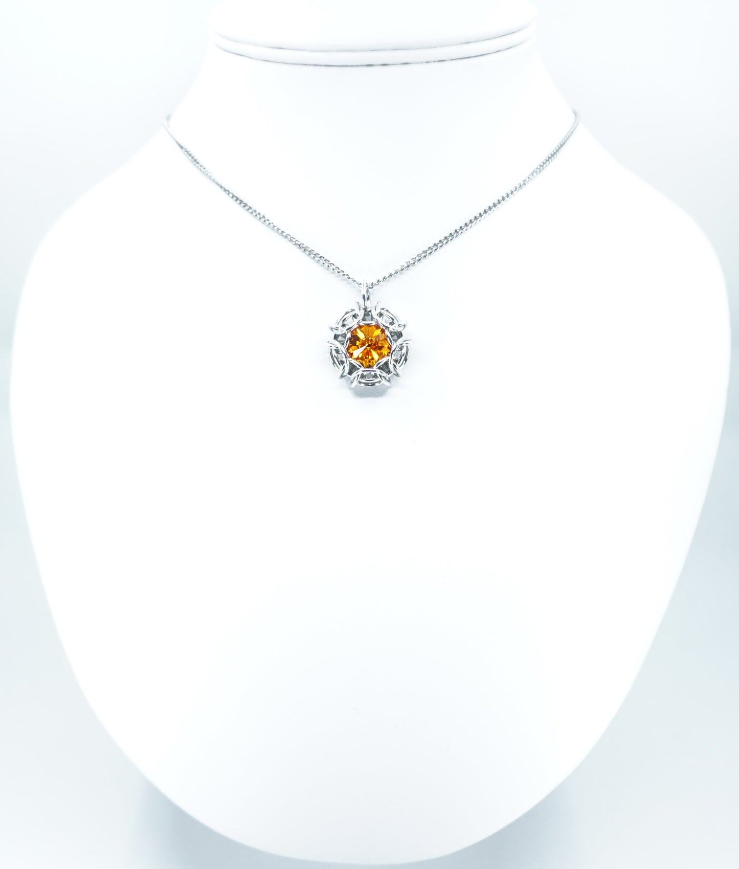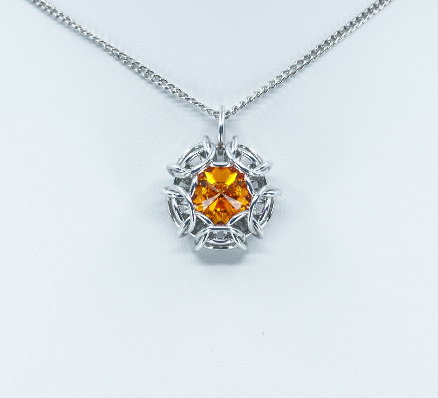 Light weight bright aluminum capture a tangerine 12mm Swarovski crystal. Stainless steel chain included