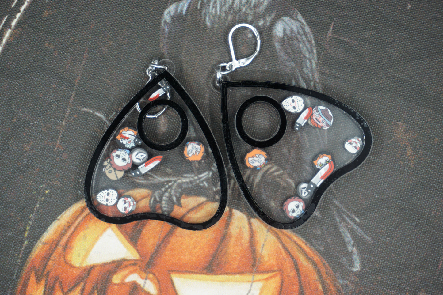 Shaker planchettes filled with horror movie and knife sprinkles. Handmade from acrylic.