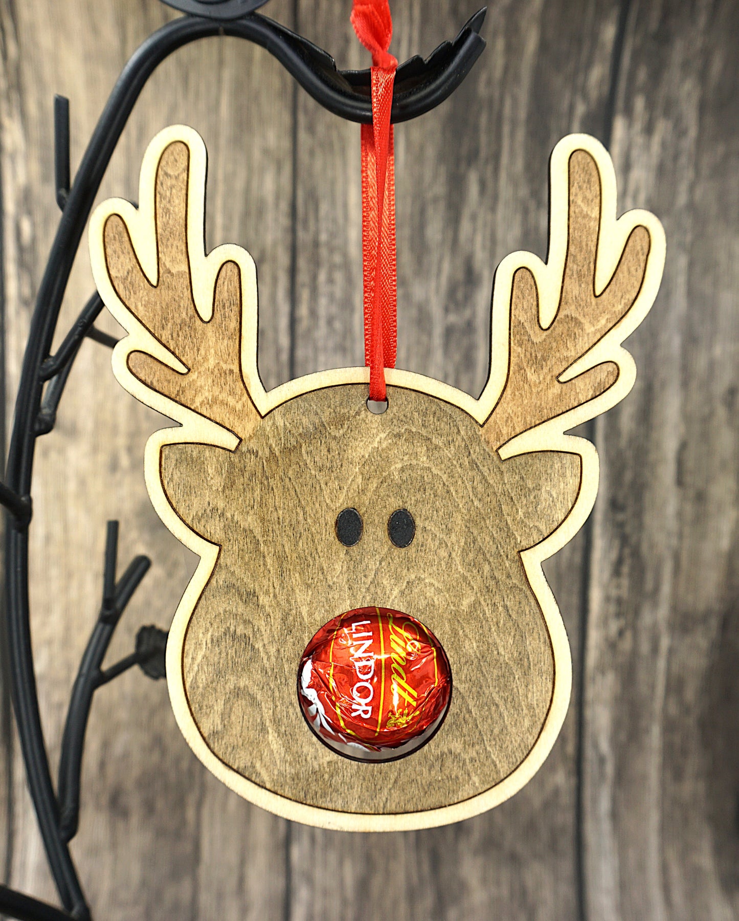 Reindeer ornament made from basswood, hand stained, perfect for teacher or office gift. Lindor truffle not included.
