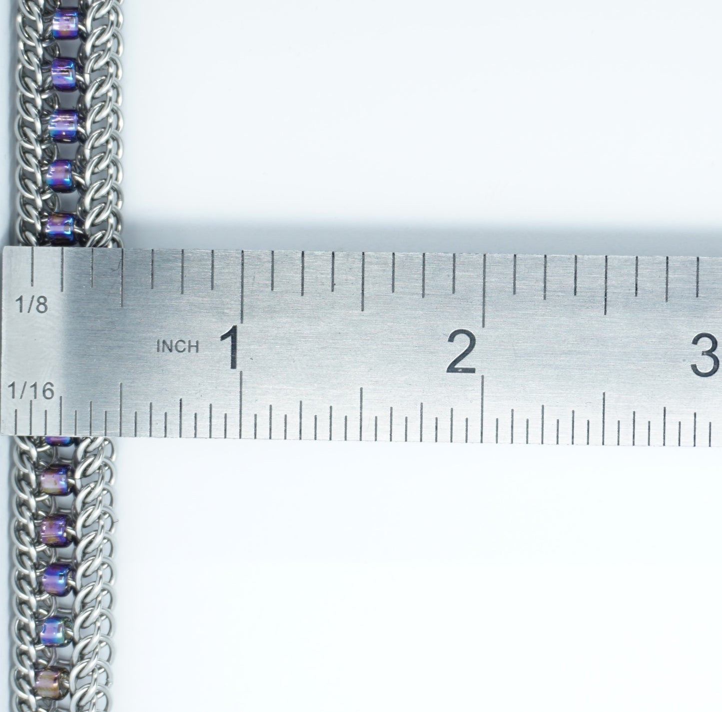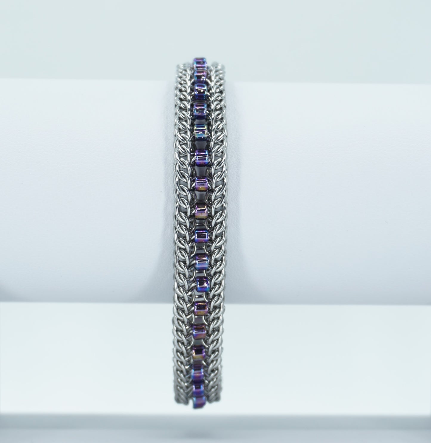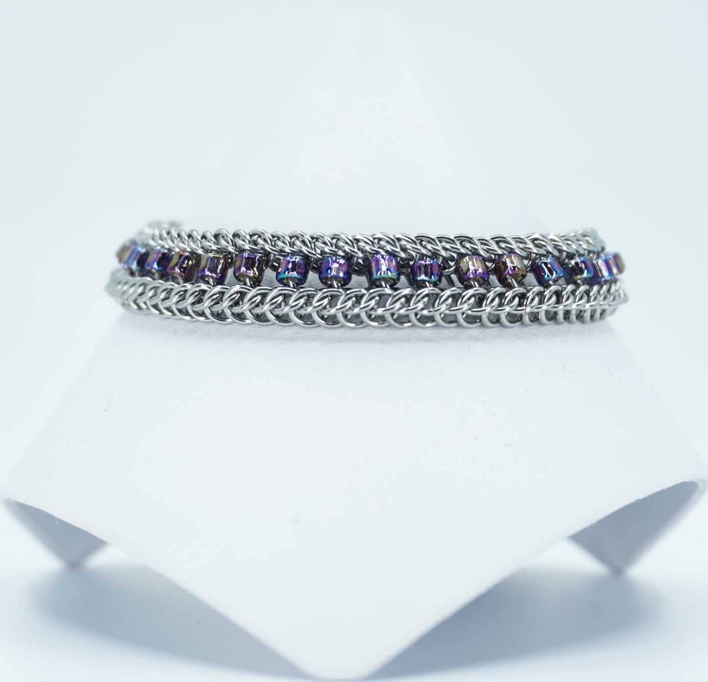 Stainless steel alligator back bracelet with silver lined purple AB seed beads.