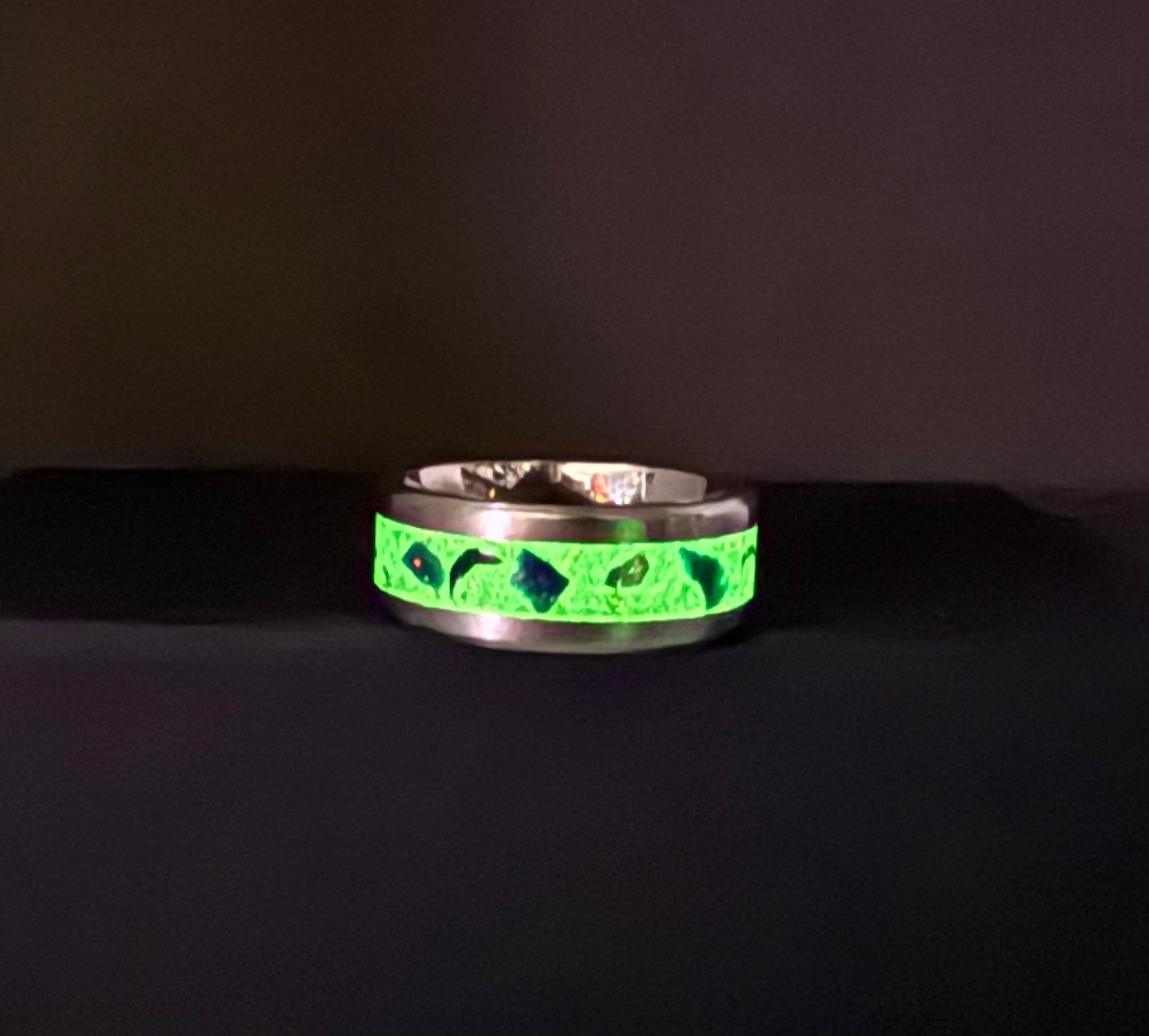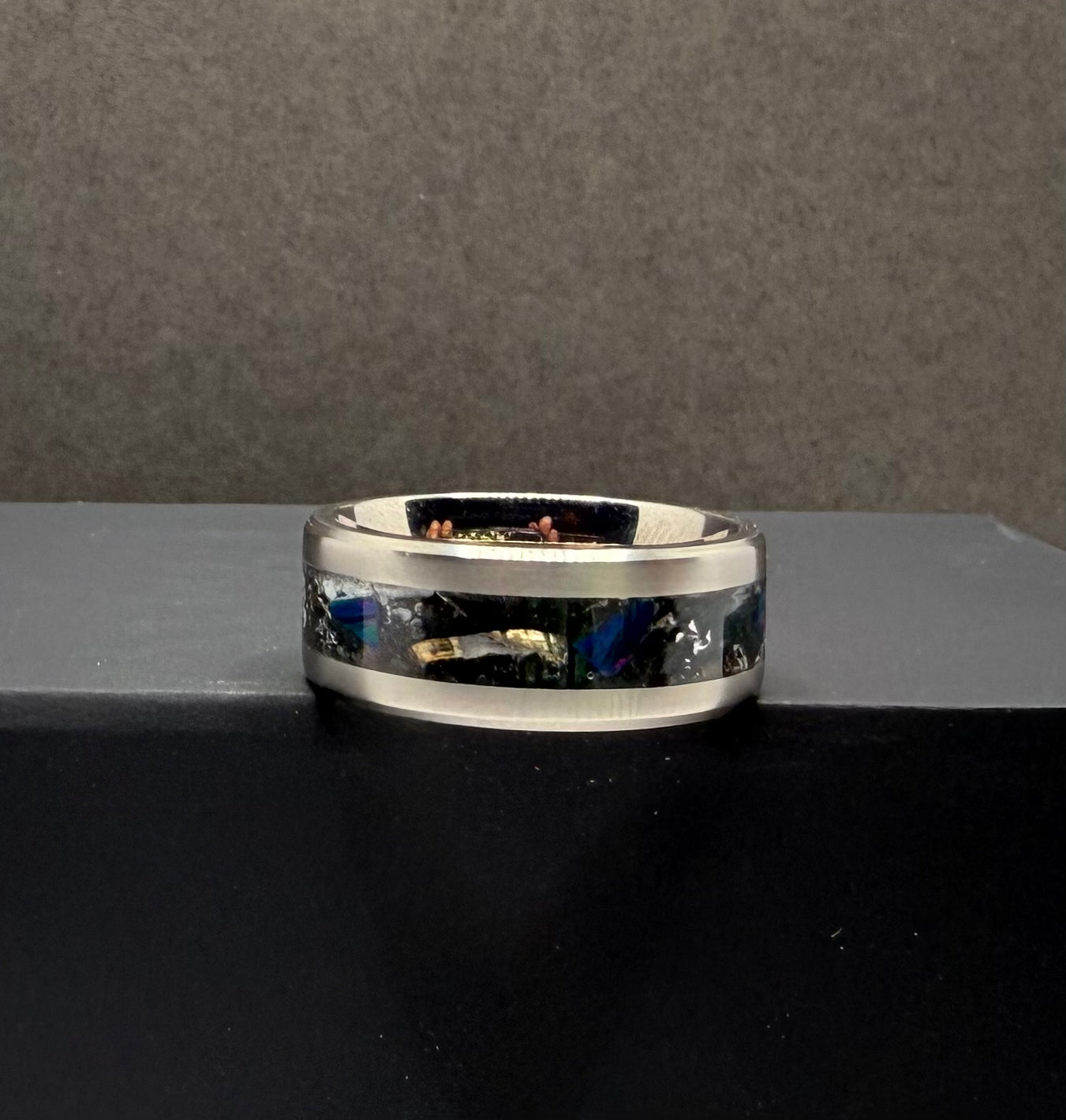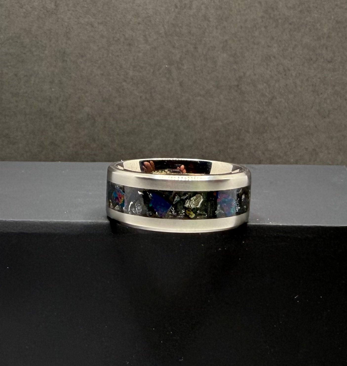 8mm titanium band with a black background, dark blue opals with red flash and meteorite fragments and green glow US size 8