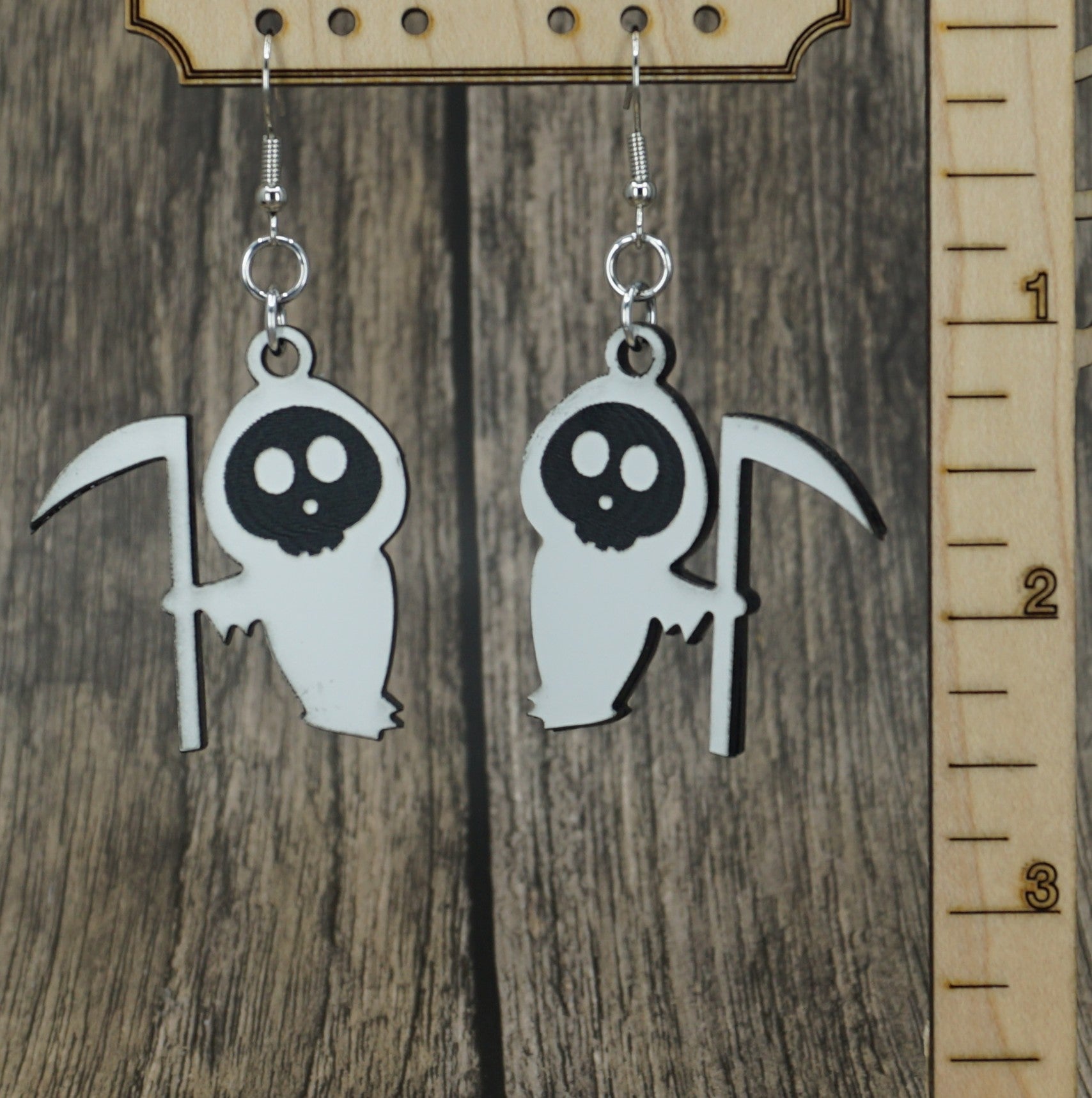 White and black dual layer acrylic grim reaper earrings with the image on the front and the back.
