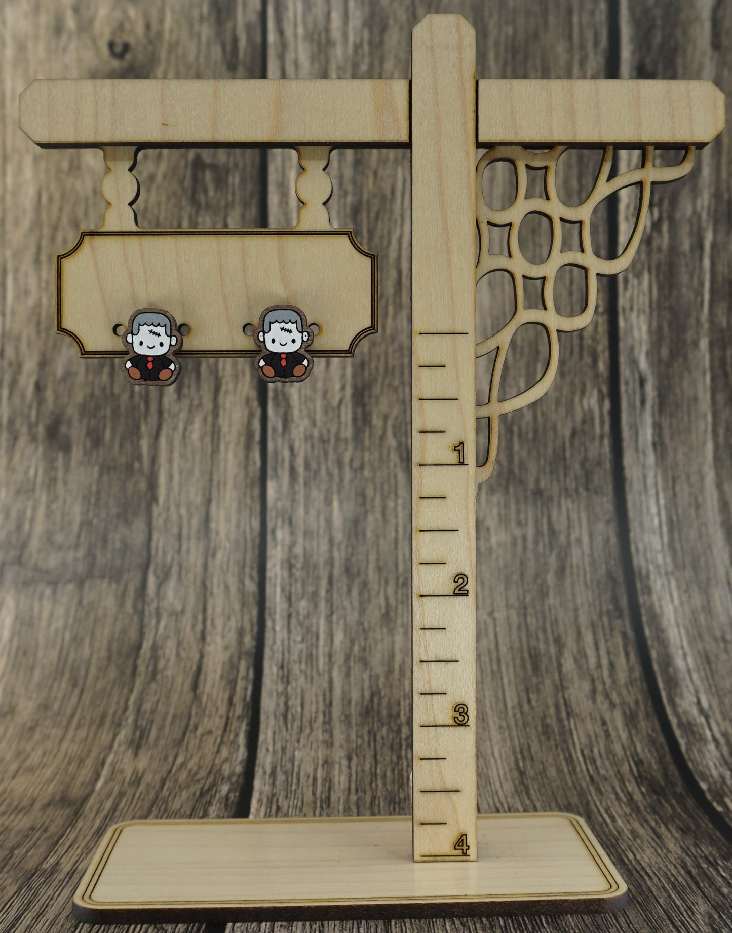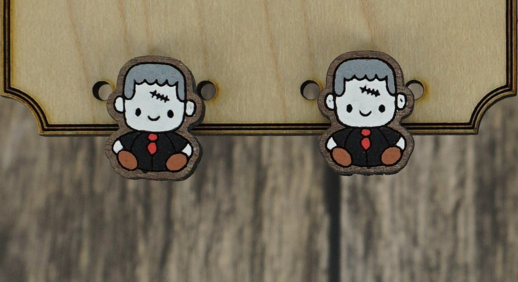 Hand painted, laser cut, Frankensteins monster earrings. These cute little Frankenstiens monsters are cut from walnut and have stainless steel earring posts.